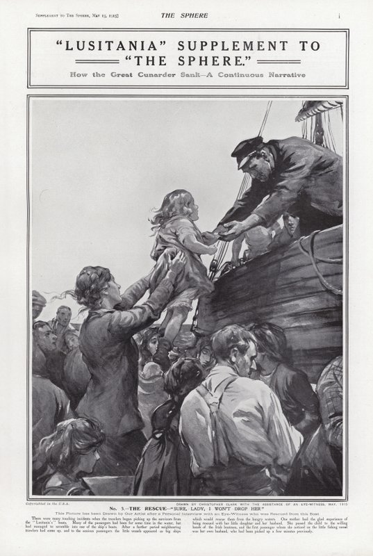 1. weltkrieg · erster weltkrieg · erster weltkrieg · seekrieg · lusitania · untergang · kreuzfahrtschiff · dampfer · propaganda · kriegsverbrechen · passagierschiff · britisch · 1910er jahre · cunard · retter · retten · irisch · fischer · Überlebende · kind · mädchen · beruhigung · Gerettet · Private Collection / Bridgeman Images · / Look and Learn |