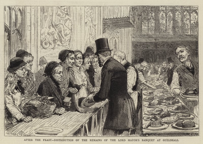 fest · verteilung · Überreste · bankett des oberbürgermeisters · rathaus · nächstenliebe · armut · london · Private Collection / Bridgeman Images · / Look and Learn |