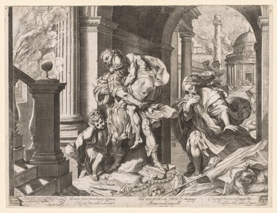 stadt · frau · tragen · frauen · frau · leute · mann · mann · männer · familie · kerl · griechenland · krieg · krieger · position · jahrhundert · verlassen · fliehen · konzept · mythologie · trojan · altes griechenland · griechische mythologie · troy · 16. jahrhundert · sechzehntes jahrhundert · engraving · agostino carracci · carracci · agostino · heritage art · Heritage Art/Heritage Images