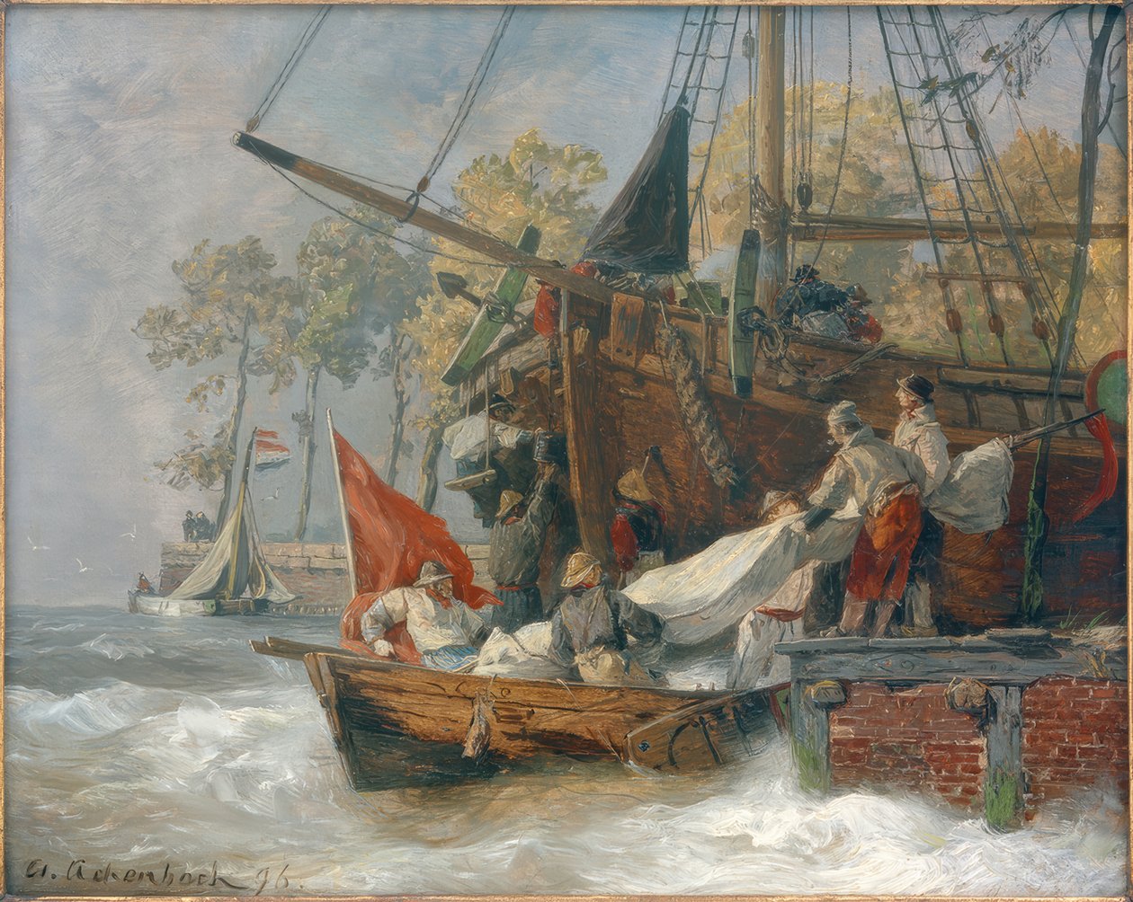 arbeit · arbeiter · boot · deutsche · kunst · düsseldorfer · malerschule · einfahrt · elemente · fischerboot · gewässer · hafen · hafenarbeiter · hilfeleistung · kleidung · allgemein · kunst · küste · landschaft · mann · männerleben · matrose · meer · mensch · meteorologie · naturgewalt · quai · regenkleidung · schiff · schifffahrt · seemann · segel · segelschiff · signatur · sturm · szene · takelung · ufer · unwetter · wasser · wetter · technik · gemälde · malerei · holz · / akg-images |