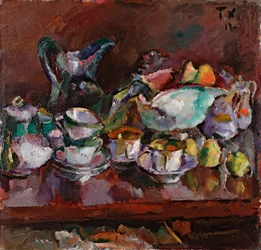 Stillleben mit Kaffeetassen von Anton Faistauer. Verfügbar als Kunstdruck auf Leinwand, Fotopapier, Aquarellkarton, Naturpapier oder Japanpapier.