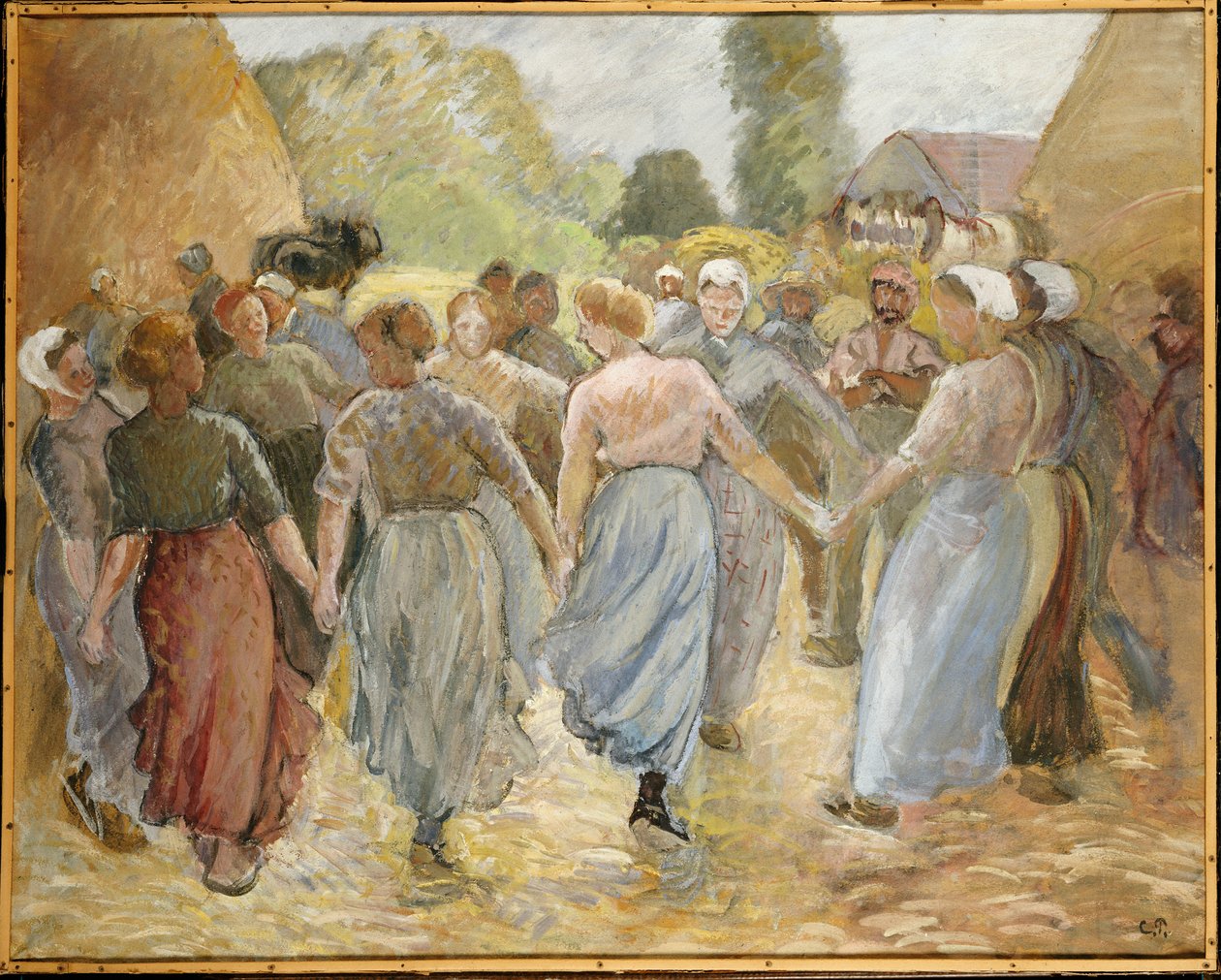 weiblich · frauen · ländlich · tänzerin · impressionistin · kreis · bauern · gruppe von menschen · volkstanz · tanzen · draußen · feier · detrempe · französisch · händchenhalten · party · tanz · bauer · rustikal · draußen · traditionell · volkstanz · tänzer · straßenszene · dorf · rund · männlicher künstler · ronde · 835c · pissarro · Camille Pissarro · Private Collection / Bridgeman Images |