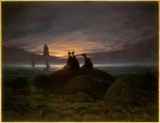 Lediglich im Vordergrund ist das Licht des Mondes kaum angelangt. Der Betrachter erhält leidglich einen Blick auf die groben Felsumrisse am Ufer des Meeres. Große und kleine bräunliche Steine sind hier erkennbar. Direkt in der Mitte des Bildes befindet sich der größte Felsen. Auf diesem Fels sitzen drei Menschen, deren Antlitz im Mondlicht erstrahlt. Neben zwei Frauen sitzt dort ein Mann mit Hut. Getrennt sind diese drei Menschen durch eine kleine Lücke zwischen dem Mann und der rechtssitzenden Frau. Der Mondschein erhellt ihre Körper so stark, dass zumindest die rötliche Farbe der Damenröcke und die blauen Oberteile wahrnehmbar sind. Alle drei Personen scheinen sehnsüchtig auf das Meer hinaus zu schauen. Es ist dabei nicht ganz klar, ob sie den Mondaufgang und die daraus folgenden Farben oder die beiden Segelschiffe, welche der Küste entgegenfahren, begutachten. Diese beiden Schiffe sind auf der linken Seite des Bildes eindeutig wahrnehmbar. Durch die fehlende Beleuchtung sind sie jedoch dunkel und frei von jeder Farbe.