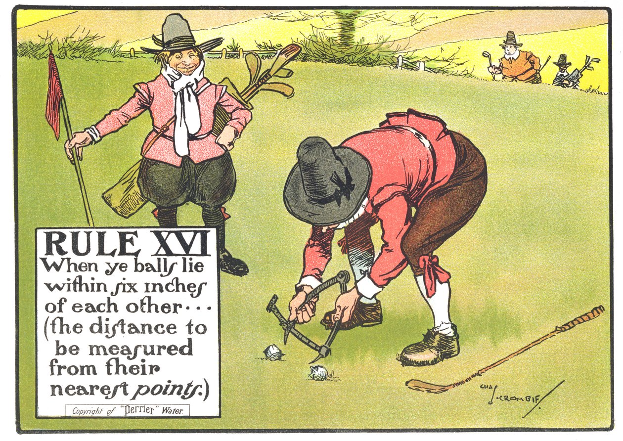 Regel XVI: Wenn die Bälle innerhalb von sechs Zoll voneinander liegen...(der Abstand wird von ihren nächsten Punkten gemessen), aus 'Regeln des Golfs', veröffentlicht um 1905(Rule XVI: When ye balls lie within six inches of each other...(the distance to be measured from their nearest points), from 'Rules of Golf', published c.1905 )Charles Crombie |