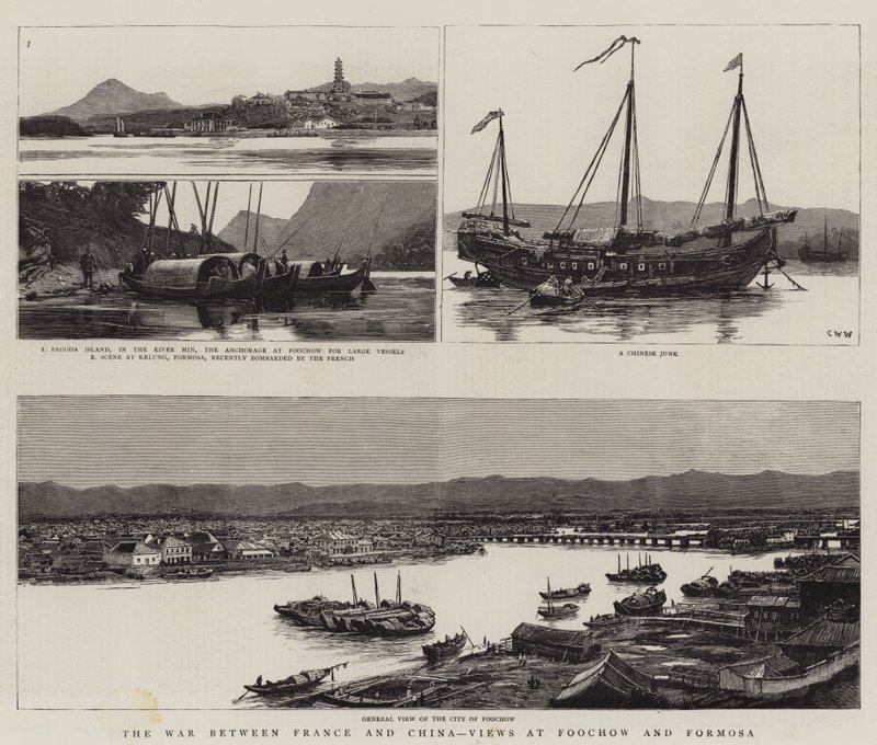 krieg · frankreich · china · ansichten · foochow · formosa · pagodeninsel · fluss min · anchorage · große gefäße · szene · kelung · bombardiert · französisch · chinesischer müll · gesamtansicht · stadt foochow · taiwan · schiffe · maritime · Private Collection / Bridgeman Images · / Look and Learn |