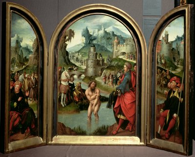 Triptychon der Reinigung von Naaman: Das Mittelteil zeigt Naaman, den Kommandanten der syrischen Armee, der im Jordanfluss badet, um seine Lepra auf Befehl des Propheten Elisha zu heilen(Triptych of the Cleansing of Naaman: the centre panel depicts Naaman, commander of the Syrian army, washing in the River Jordan to cure his leprosy at the command of the prophet Elisha, who in the bac)Cornelis Engebrechtsz |