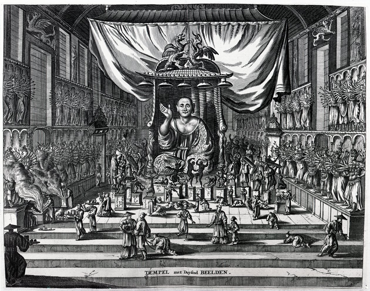 Ein buddhistischer Tempel, eine Illustration aus 'Atlas Chinensis' von Arnoldus Montanus, 1671(A Buddhist Temple, an illustration from 'Atlas Chinensis' by Arnoldus Montanus, 1671 )Dutch School |