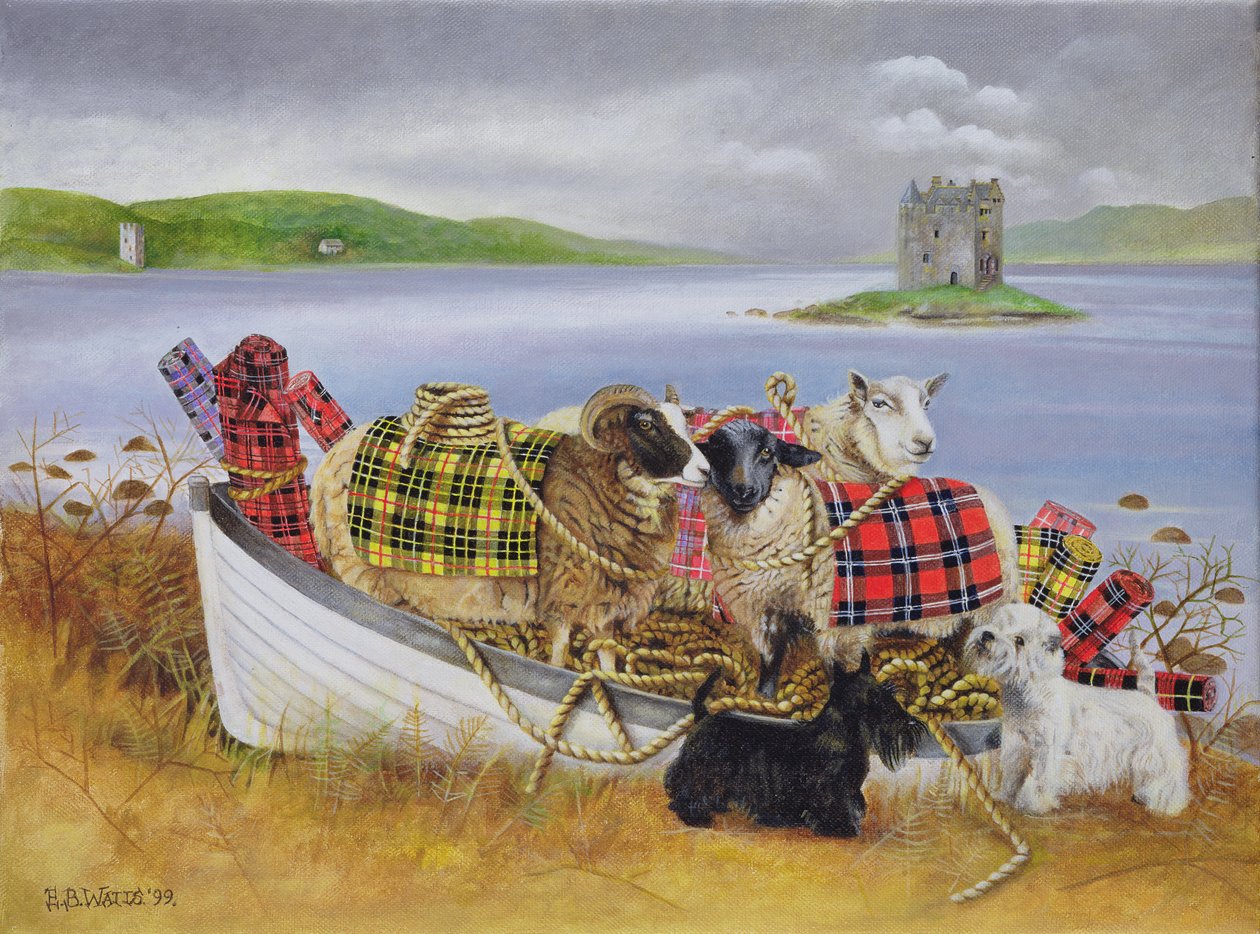 Schafe mit Tartan, 1999 von E.B. Watts. Verfügbar als Kunstdruck auf Leinwand, Fotopapier, Aquarellkarton, Naturpapier oder Japanpapier.