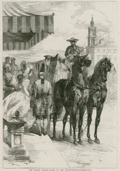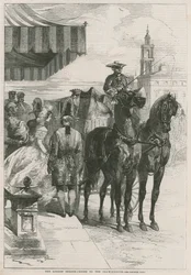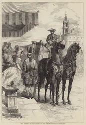Dame geht während der Pfingstmontags-Kutschparade im Regents Park; Prinzessin May überreicht die Abzeichen Ein Millionär von Rough-and-Ready, von Bret Harte Eyre Eine Wiedererkennung Der Besuch des Kaisers beim Zaren Maifeiertag, die Kaltblutparade, Preisträger Eröffnung der Kolonial- und Indien-Ausstellung in South Kensington, Ankunft der Königin Rückkehr des französischen Präsidenten Felix Faure von seinem Besuch in Russland, 1897 Die unterbrochene Reise Für Glauben und Freiheit, von Walter Besant Königin Annes letzter Weg zum Parlament Ein Block in der Park Lane, London Ein Block in der Park Lane Präsentation von Pferden an den Kaiser der Franzosen vom Bey von Tunis Verlegung von Charles aus Hurst Castle Geflohen! Eine Szene im Bois de Boulogne Musikpartitur für The West End, eine Polka von Charles DAlbert Empfang von Lord Wellington und den englischen Truppen in Frankreich Dos Amigos Die feierliche Eröffnung des Parlaments, 16. Januar Die Restauration von Charles II Öffentlicher Empfang von Prinz Charles in Madrid, Illustration aus Cassells Illustrierter Geschichte Englands Die Restauration von Karl II. In Eaton Square Marie de Rabutin-Chantal (Rabutin Chantal), Marquise de Sévigné dit Madame de Sévigné (1626-1696) zwingt Gilles Ménage (1613-1692), französischer Grammatiker und Schriftsteller, in ihrer Kutsche zu fahren. Gravur von A. Duruy in „Illustrations littéraires Königin Victorias Jubiläum
