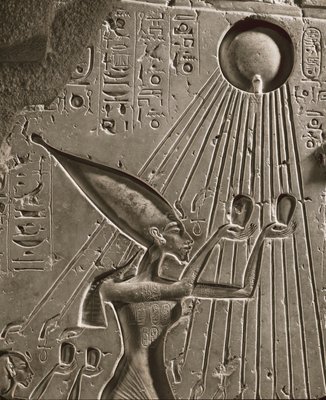 Ägypten, Tell el-Amarna, Basrelief, das Amenhotep IV (Pharao Echnaton, ca. 1360-1342) beim Anbeten der Sonnenscheibe darstellt, achtzehnte Dynastie, Neues Reich(Egypt, Tell el-Amarna, Bas-relief depicting Amenhotep IV (Pharaoh Akhenaten, circa1360- 1342) while worshiping the solar disc, eighteenth dynasty, New Kingdom (limestone))Egyptian 18th Dynasty |