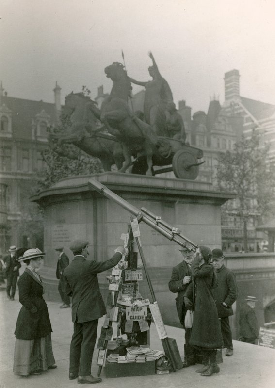 fernrohre · straßenszenen · strassenhändler · london · damm · menschen · männer · frauen · mann · verkauf · ansichten · fernrohr · Private Collection / Bridgeman Images · / Look and Learn