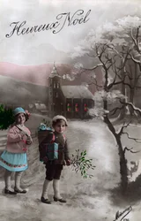 edwardian postkarte · kind · kinder · frohe weihnachten · schnee · regenschirm · grußkarte · Private Collection / Bridgeman Images · / Look and Learn |