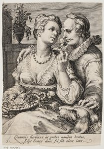 Eine Frau mit Blumen, Illustration aus 'A Work for none but Angels and Men', von Sir John Davies, gedruckt 1653(A woman with flowers, illustration from 'A Work for none but Angels and Men', by Sir John Davies, printed 1653 (litho))English School |