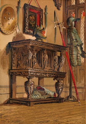 Elisabethanisches Sideboard oder Schrank in Warwick Castle (farbige Gravur)(Elizabethan sideboard or cupboard at Warwick Castle (coloured engraving))English School |