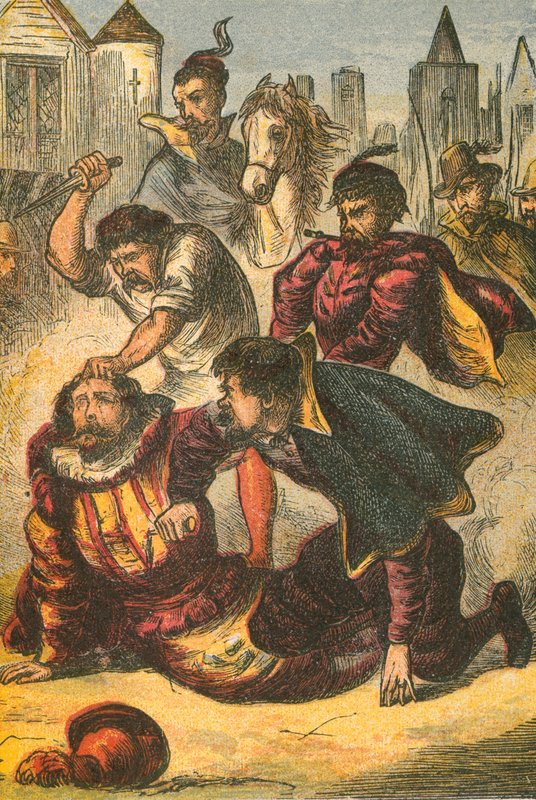 john foxe · das buch der märtyrer · märtyrer · protestant · ermordung · pierre d la place · petrus plateannus · petrus a platea · straße · messer · angegriffen · Private Collection / Bridgeman Images · / Look and Learn |