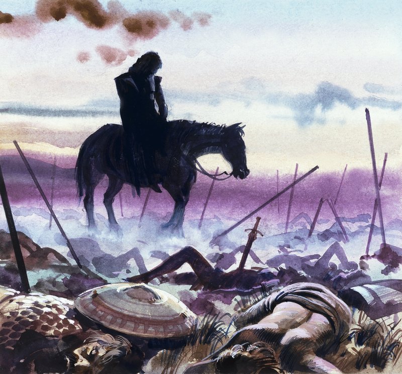 schlachtfeld · zerstörung · trauer · trauer · pferd · melancholie · schwerter · schilde · Verschwendung · Private Collection / Bridgeman Images · / Look and Learn |