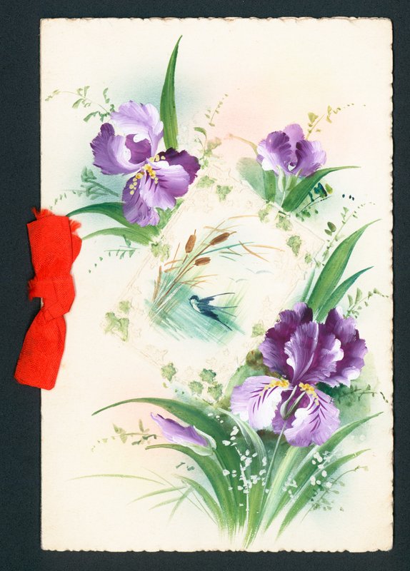 schöne grüße · gruß · karte · blumen · iris · lila · violett · blätter · stängel · knospen · bull rush · wasser · vogel · schlucken · fliegend · flug · bogen · rote schleife · Private Collection / Bridgeman Images · / Look and Learn |