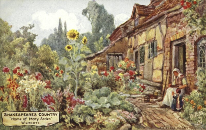 postkarte · ländlich · rustikal · idyllisch · hütte · haus · britisch · großbritannien · englisch · england · literatur · william shakespeare · warwickshire · garten · blumen · sonnenblume · frau · mary arden · wilmcote · Private Collection / Bridgeman Images · / Look and Learn |