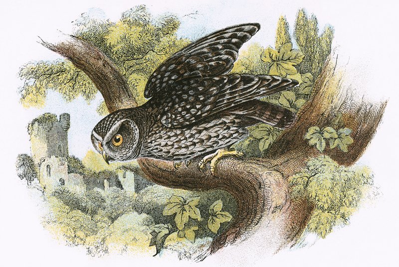 britische vögel · vogel · ornithologie · englisch · steinkauz · Private Collection / Bridgeman Images · / Look and Learn |