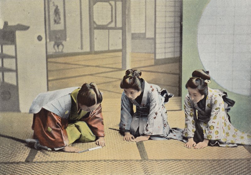japon · japan · japanisch · visite de ceremonie au japon · besuch · zeremonie · mädchen · frauen · weiblich · höflichkeit · zuhause · matte · matten · matten · kimono · haar · stil · kleid · mode · Private Collection / Bridgeman Images · / Look and Learn