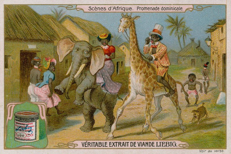 szenen aus afrika · humorvoll · 1900er jahre · kolonial · afrikaner · ebenen · giraffen · elefanten · inländisch · täglich · leben · sonntagsspaziergang · tiere · dorf · Private Collection / Bridgeman Images · / Look and Learn |