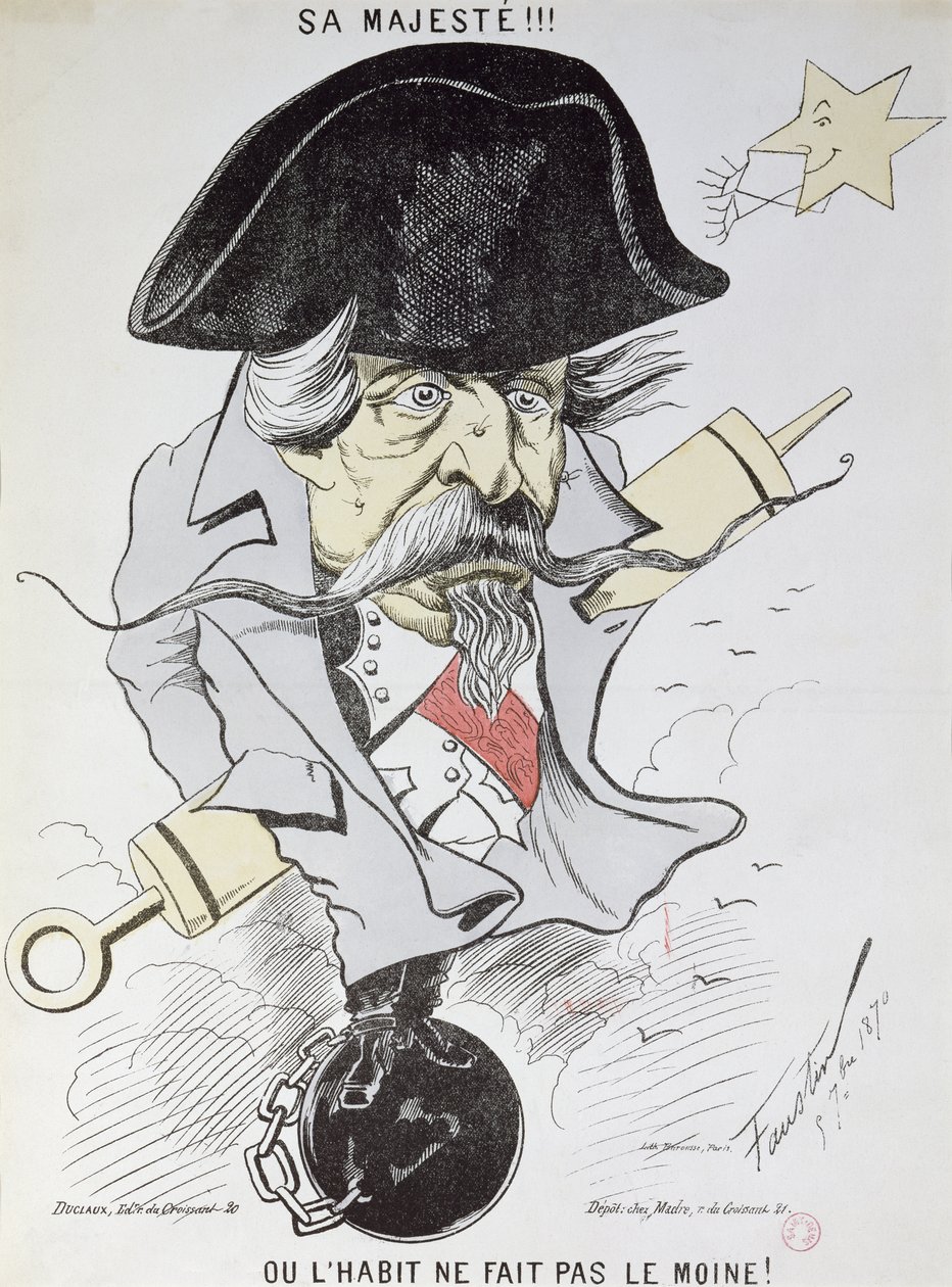 'Sa Majeste!!! Ou l'habit ne fait pas le moine!', Karikatur von Louis-Napoleon Bonaparte (1808-73), 5. September 1870('Sa Majeste!!! Ou l'habit ne fait pas le moine!', caricature of Louis-Napoleon Bonaparte (1808-73) 5th September 1870 )Faustin |