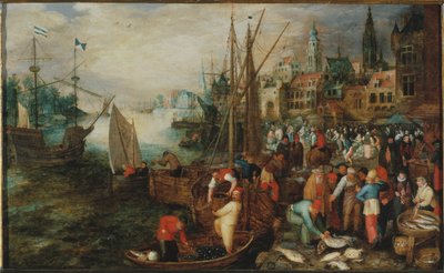 Hafen und Markt in Antwerpen(Port and market at Antwerp (oil on oakwood))Flemish School |