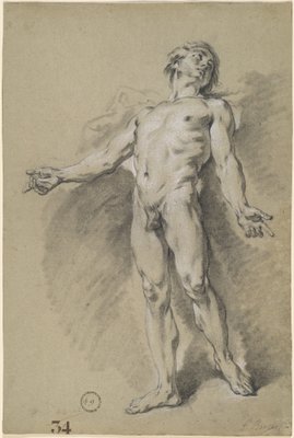 black chalk and stumping, heightened with white chalk on greenish-gray laid paper