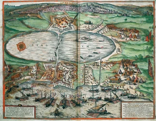 Ansicht von Tunis, Tunesien, mit der Festung Goulette, die den Zugang zum See von Tunis kontrolliert, und der neuen Festung vor den Stadtmauern(View of Tunis (Tunes), Tunisia, with the fortress of Goulette (Guleta Arx) which controls access to Lake Tunis and the new fortress (nova arx) in front of the city walls (etching)Franz Hogenberg |
