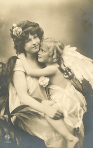 postkarten · postkarte · karte · kind · liebe · putto · putten · klein · junge · angezogen · amor · pfeil · mund · Private Collection / Bridgeman Images · / Look and Learn |