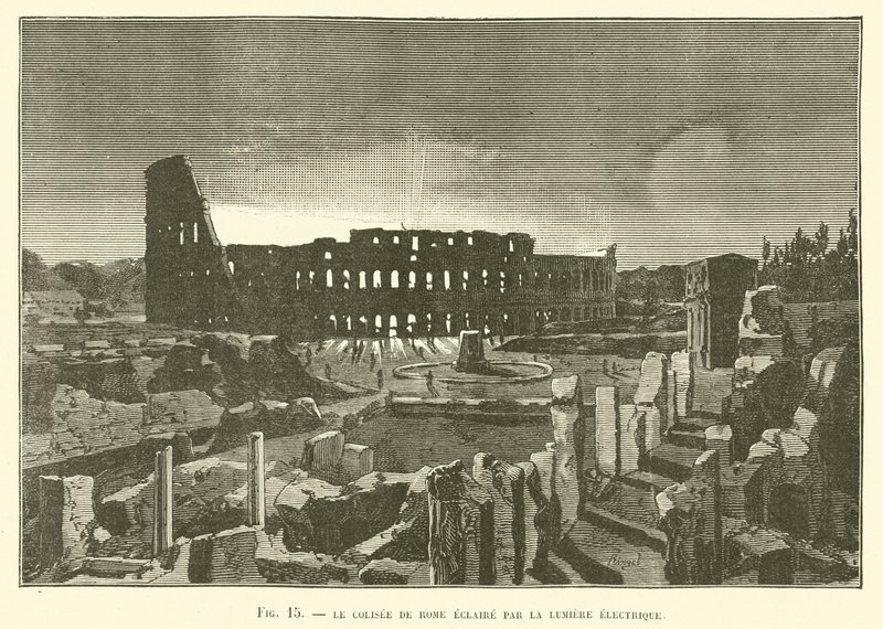 elektrizität · elektrisch · fortschritt · entdeckung · entdeckungen · technologie · industrie · wissenschaft · wissenschaftlich · coloseum · kolosseum · italien · Beleuchtung · Private Collection / Bridgeman Images · / Look and Learn |