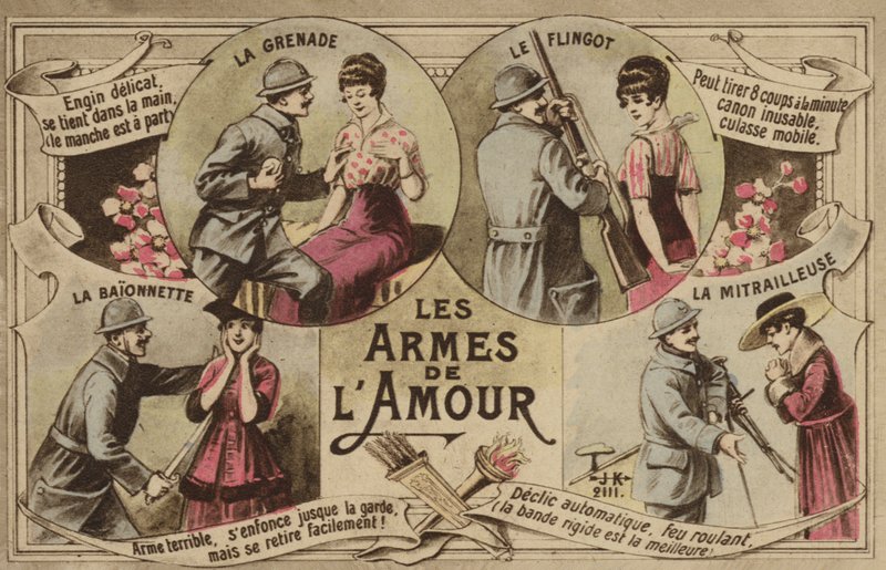 granate · humor · liebe · waffen · militär · beziehungen · liebende · französisch · parallelen · kriegszeit · postkarte · stumpf · herz · lustig · sitten · verführung · postkarten · erster weltkrieg · les armes de lamour · Frankreich · Private Collection / Bridgeman Images · / Look and Learn |