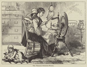 Textil, Leinen. Eine Frau benutzt ein mechanisches Spinnrad, um Leinen zu spinnen. Gravur. Epinal-Bildgebung Ende des 19. Jahrhunderts.(Textile, linen. A woman uses a mechanical spinning wheel to spun linen. Engraving. Epinal imaging late 19th century.)French School |