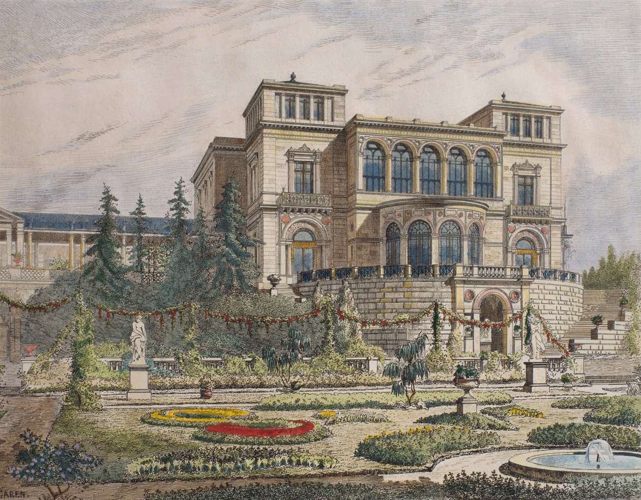 Schloss bei Stuttgart, Veranda-Fassade, Illustration aus 'Le Moniteur des architectes', 1881(Castle near Stuttgart, veranda facade, illustration from 'Le Moniteur des architectes', 1881 (colour engraving))Georges Felix Garen |