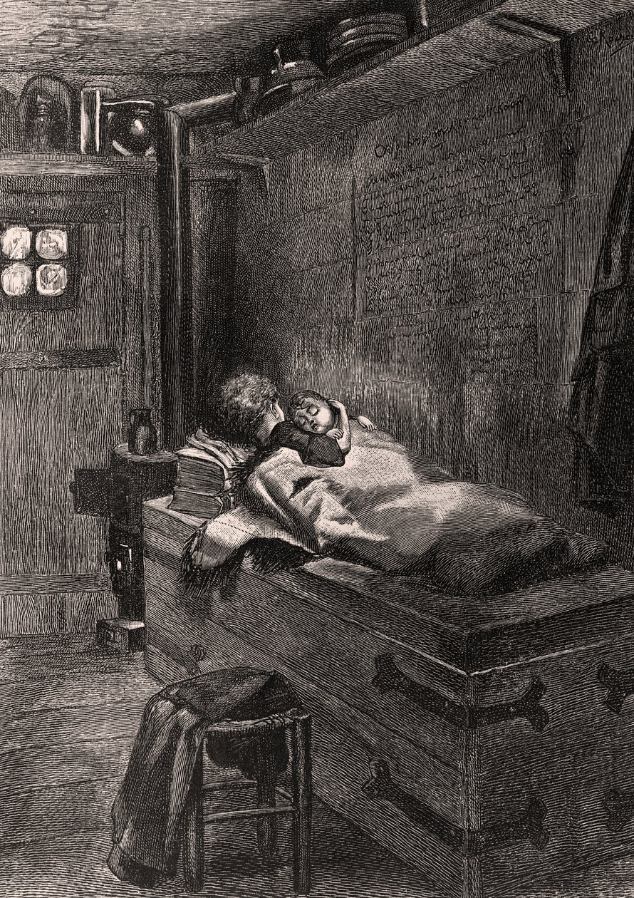 Gwynplaine und Dea schlafen auf einer Truhe - Illustration aus 'L'Homme qui rit', 19. Jahrhundert(Gwynplaine and Dea sleeping on a chest - illustration from L’Homme qui rit, 19th Century (bw engraving))Georges Marie Rochegrosse |
