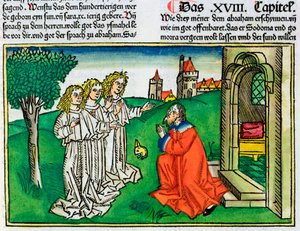 (Deuteronomy: Frontispiece in which God makes the Laws, from the Nuremberg Bible (Biblia Sacra Germanaica) (coloured woodcut))
