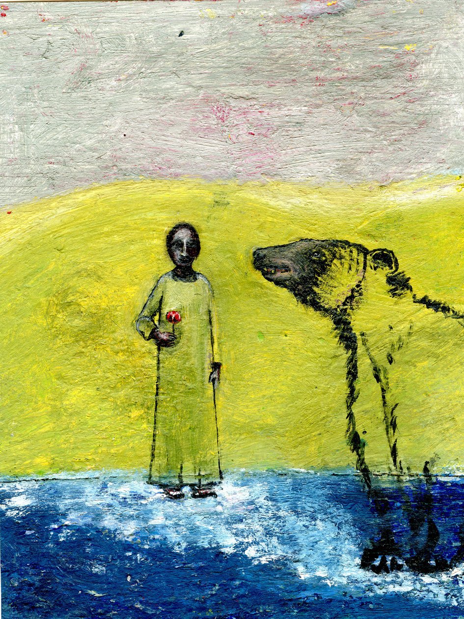 frau · person · figur · einsame figur · kleid · langes kleid · gelbes kleid · gewand · gelbes gewand · rose · rote rose · tier · bär · braunbär · gelber bär · macht · kontrolle · wasser · fluss · wasserrand · ufer · meeresküste · hügel · gelbe hügel · gabe · verständnis · werden · veränderung · stille · stille · warten · wartespiel · angst · hoffnung · beziehung · balhandled · malen · aquarell · Private Collection / Bridgeman Images |