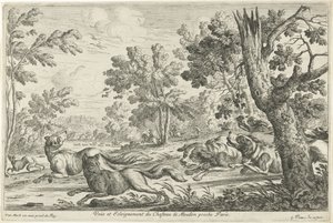 Fuchs mit Pfote in Falle und aufgeschreckter Schwan und Enten am Wasser(Vos met poot in val en opvliegende zwaan en eenden bij water)Gilles Demarteau(print maker),Charles Dagomer(after design by),Gilles Demarteau(publisher) |