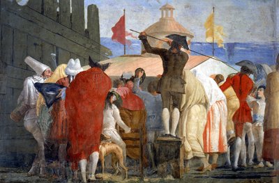 mondo nuovo · zuschauer · show · peep-show · peepshow · novo · satirisch · satire · kritisch · gesellschaftskritik · zuschauer · unterhaltung · magische laterne · kosmorama · fresko · Ca' Rezzonico, Museo del Settecento, Venice, Italy / Bridgeman Images