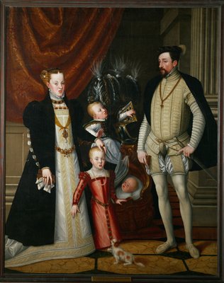 Kaiser Maximilian II. (1527-1576) mit seiner Familie: Maria von Spanien (1528-1603) und ihre Kinder Anne (1549-1580), Rodolph (1552-1612) und Ernst (1553-1591)(Emperor Maximilian II (1527-1576) with his family: Mary of Spain (1528-1603), and their children Anne (1549-1580), Rodolph (1552-1612) and Ernest (1553-1591) Painting by Giuseppe Arcimboldi (or Arcimboldo) (1527-1593) 1553 Sun. 188x240 cm Ambras Castle, In)Giuseppe Arcimboldo |