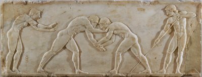 Junge Männer beim Ringen, von einer Statuenbasis gefunden im Dipylon-Friedhof, Athen, c.510 v. Chr.(Young men wrestling, from a statue base found in the Dipylon Cemetery, Athens, c.510 BC (marble) (see also 60008-9 and 60011))Greek |