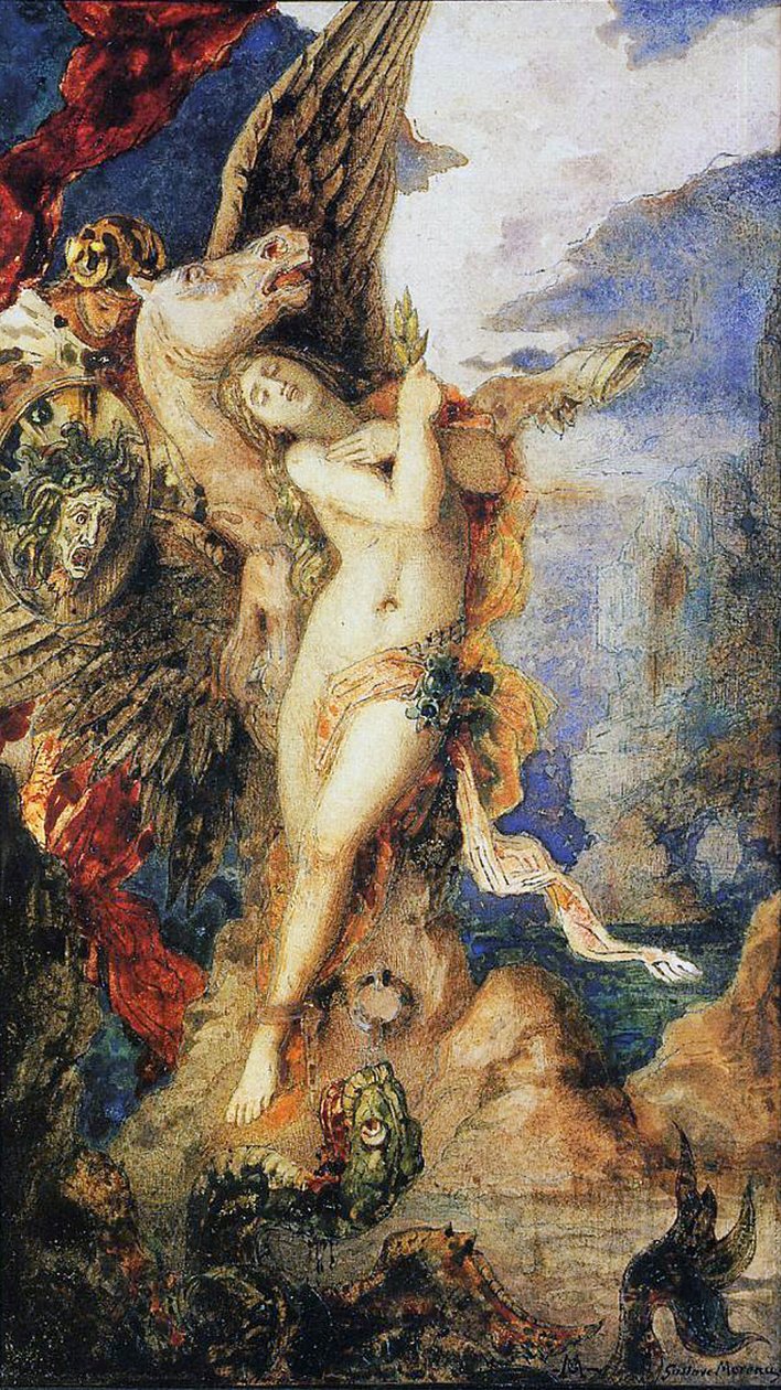 mythologisch · mythologie · griechischer mythos · weiblich · nackt · opfer · gefesselt · gefesselt · felsen · seemonster · tier · drache · schlange · rettung · rettung · rettung · männlich · pegasus · pferd · flügel · schild · kopf · medusa · felsen · felsen · held · liebhaber · Private Collection / Bridgeman Images |
