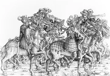 zehn · musiker · trompeten · siegeszug · maximilian i. · kaiser von rom · musik · musiker · spiel · musikinstrumente · pferde · reiter · habsburger · habsburger · maximillianer · sieger · renaissance des nordens · pracht · triumph · banner · banner · kostüm · 15. jh. · gefiedert · hüte · Federn · Gefiedert · Private Collection / Bridgeman Images
