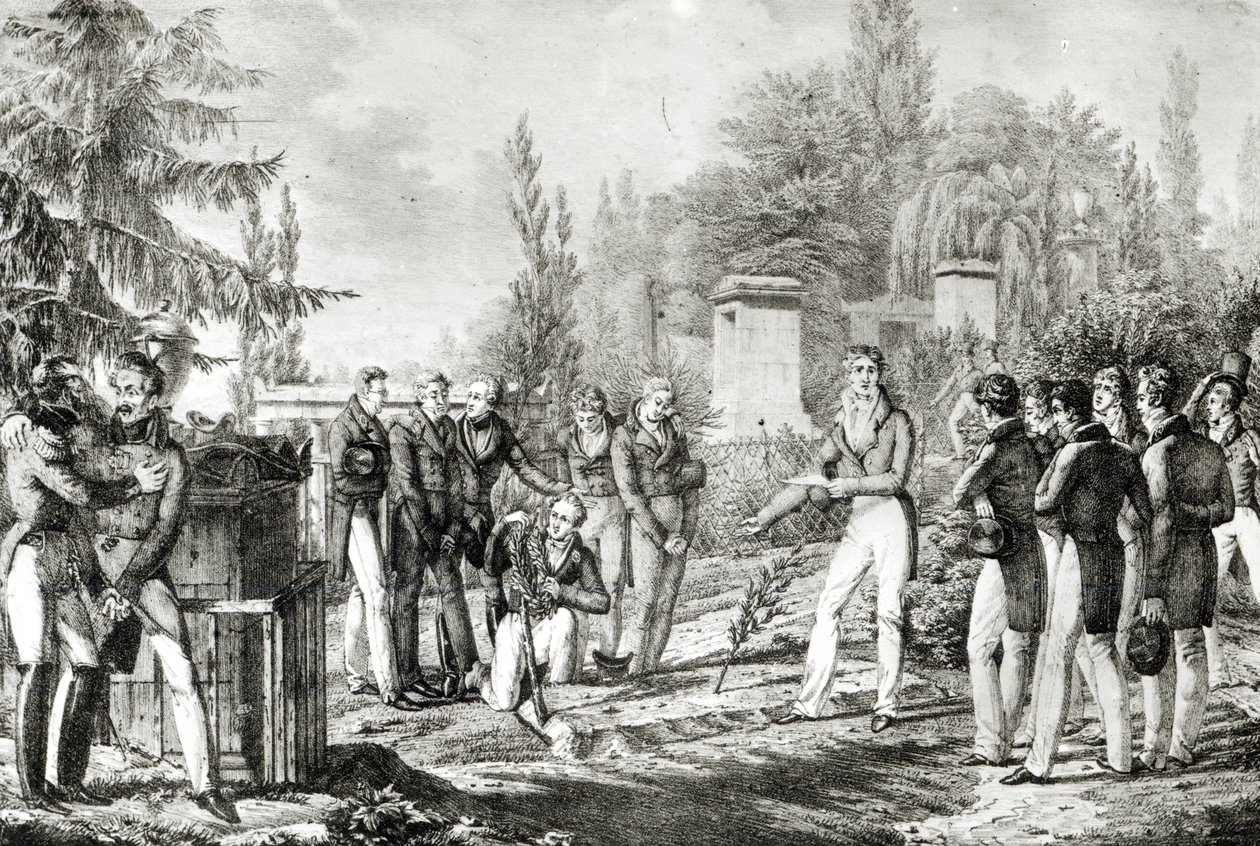 Studenten der Ecole Polytechnique am Grab von Gaspard Monge, September 1818(Students from the Ecole Polytechnique at the tomb of Gaspard Monge (1746-1818), September 1818 )Hippolyte Lecomte |