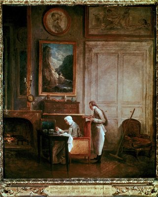 essen · essen · frau · dienerin · vorlesen · lehren · lernen · alte frau · interieur · kamin · siecle des lumieres · aufklärung · intellektuelle · blaustufen · bleublau · besserung · selbstverbesserung · Private Collection / Bridgeman Images