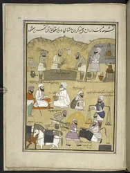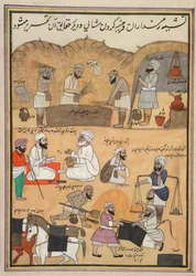 Reis dreschen, wiegen und in Satteltaschen verpacken(Threshing paddy, weighing it and packing it in saddle-bags, 86 drawings bound into a volume depicting trades and occupations in Kashmir, Craftsmen are shown at work with their implements and equipment, By a Kashmir artist, probably at Srinagar, c.1850-)Indian School |