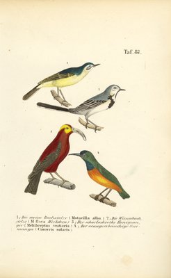 Bachstelzen und exotische Sonnenvögel von J. W. Tenhaeff. Verfügbar als Kunstdruck auf Leinwand, Fotopapier, Aquarellkarton, Naturpapier oder Japanpapier.