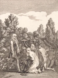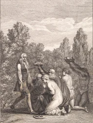 Niels Klim wird von den Qvamiten geehrt, die ihm Geschenke bringen und vor ihm knien(Niels Klim hyldes af Qvamiterne, der bringer ham gaver og knæler for ham)J.F. Clemens,Nicolai Abraham Abildgaard |