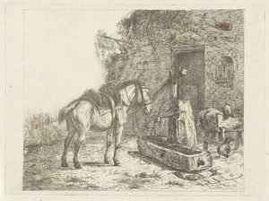Figur mit einem Pferd bei einer Futterkrippe (Sechs Drucke nach Zeichnungen verschiedener Meister)(Figuur met een paard bij een voederbak Zes prenten naar tekeningen van diverse meesters (series title on object))Jacob Elias van Varelen(print maker),Philips Wouwerman (possibly)(after drawing by) |