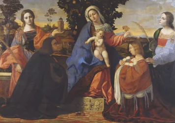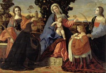 sacra conversazione · heiliger · madonna · kind · jungfrau maria · renaissance · feder · beten · anbetung · frucht · apfel · giustina · turm · spender · spender · heiliger · heiliger · Justine · Galleria Borghese, Rome, Italy / Bridgeman Images